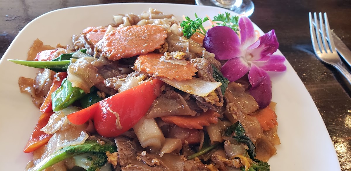 A popular choice among regulars is the Tom Yum Soup, a zesty, fragrant soup packed with shrimp, mushrooms, and fresh herbs. It's the perfect balance of sour, salty, and spicy flavors, offering a burst of deliciousness with every spoonful. Another must-try dish is the Pad See Ew, a stir-fry made with wide rice noodles, savory soy sauce, and a choice of protein. The smoky, charred flavors of the noodles combined with tender chicken or beef make it a crowd favorite.